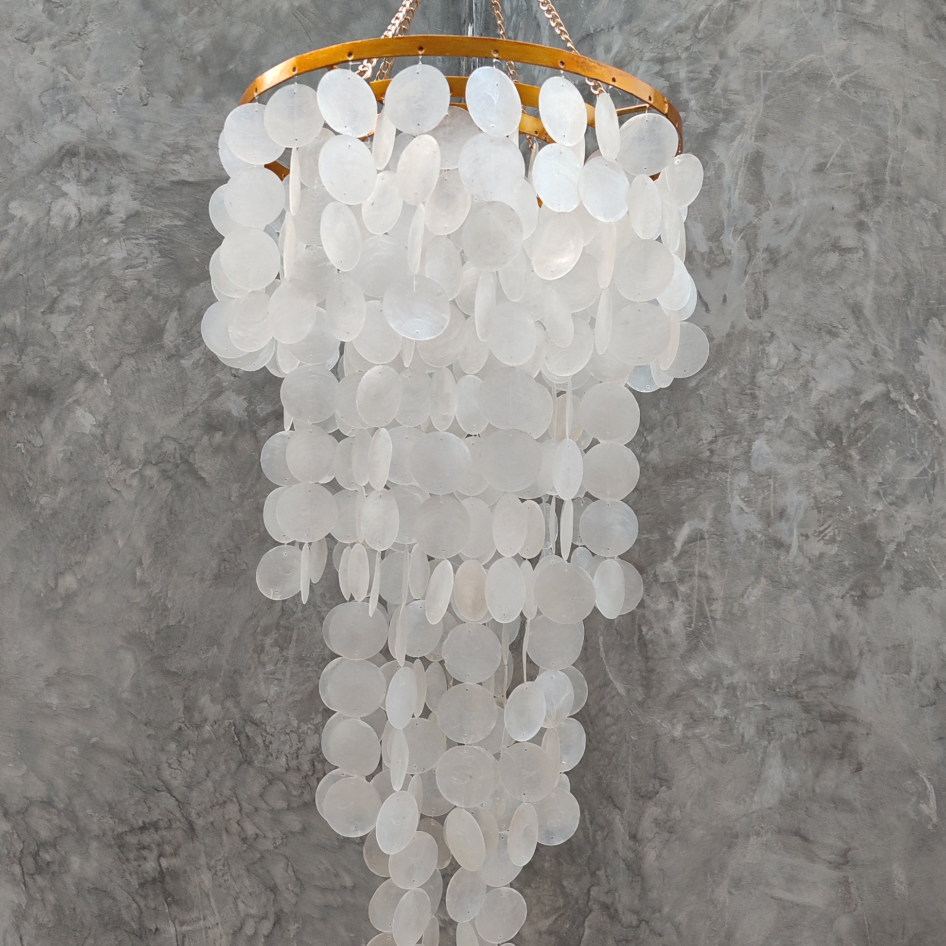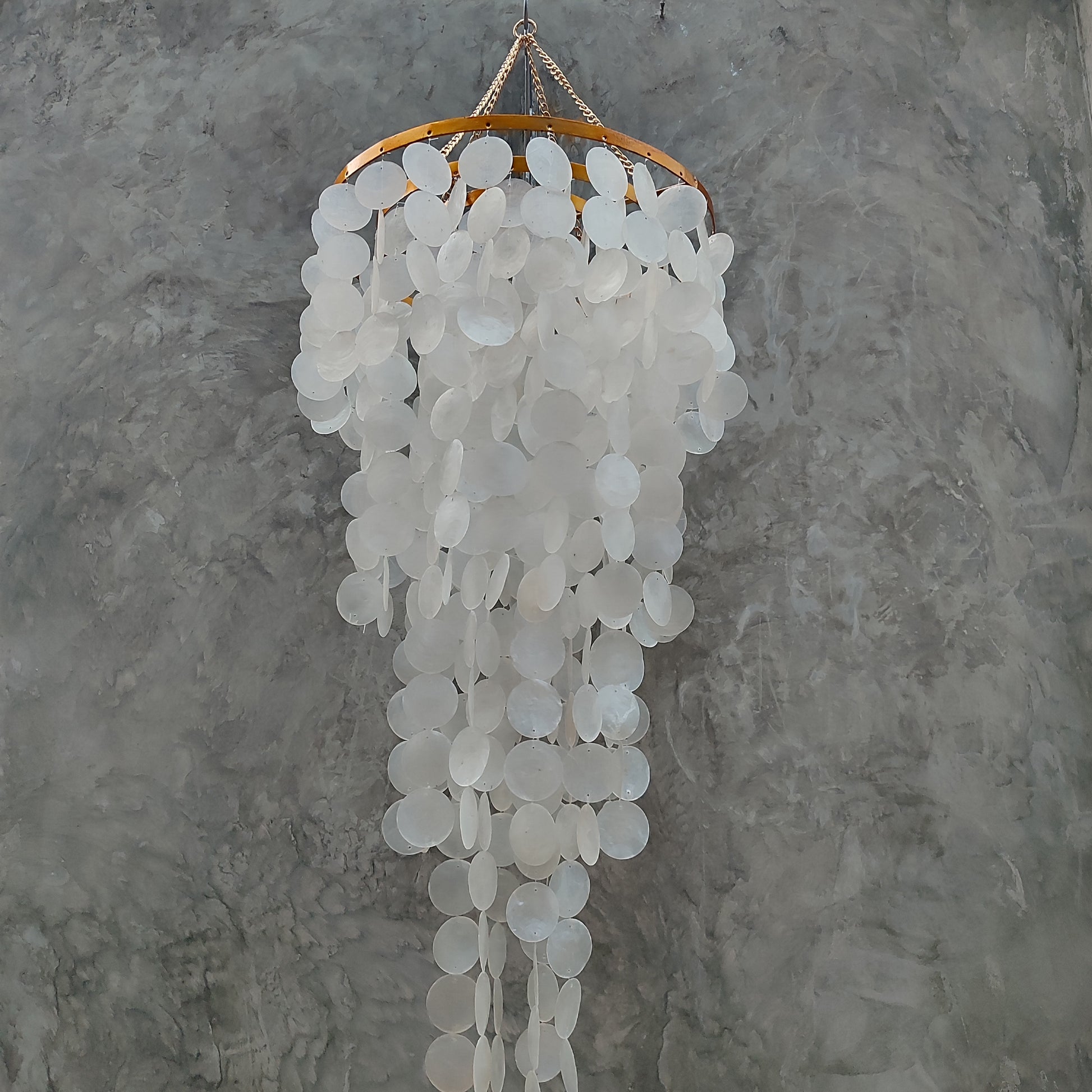 This stunning wind chime chandelier is designed for exterior or interior use as with terraces, living room, decks, balconies, patios, and other places. The sounds emanating the natural shell wind chime bring forth sensations of relaxation and calm.