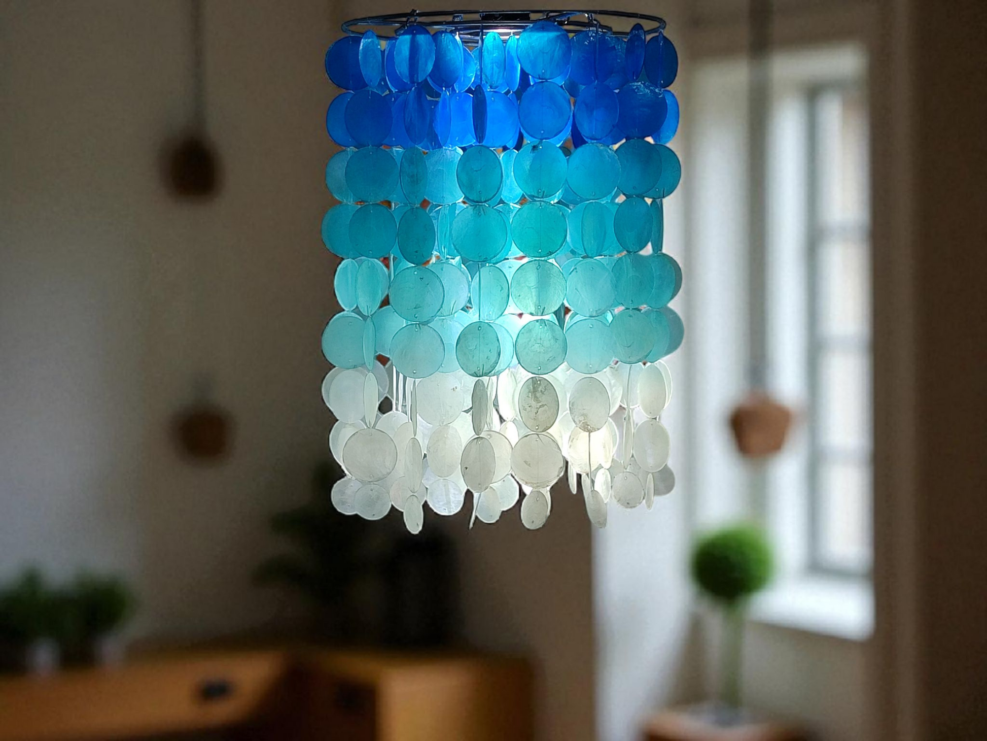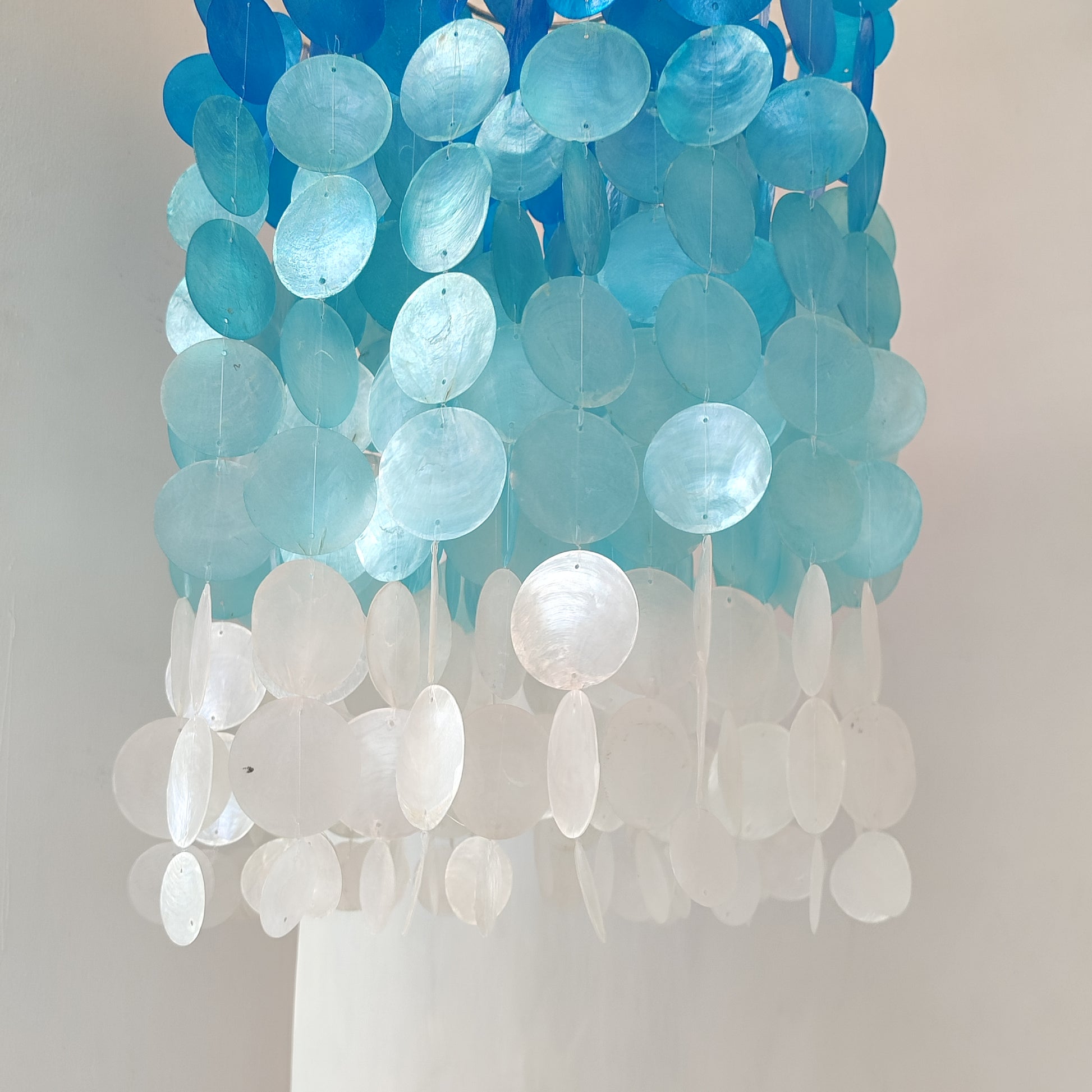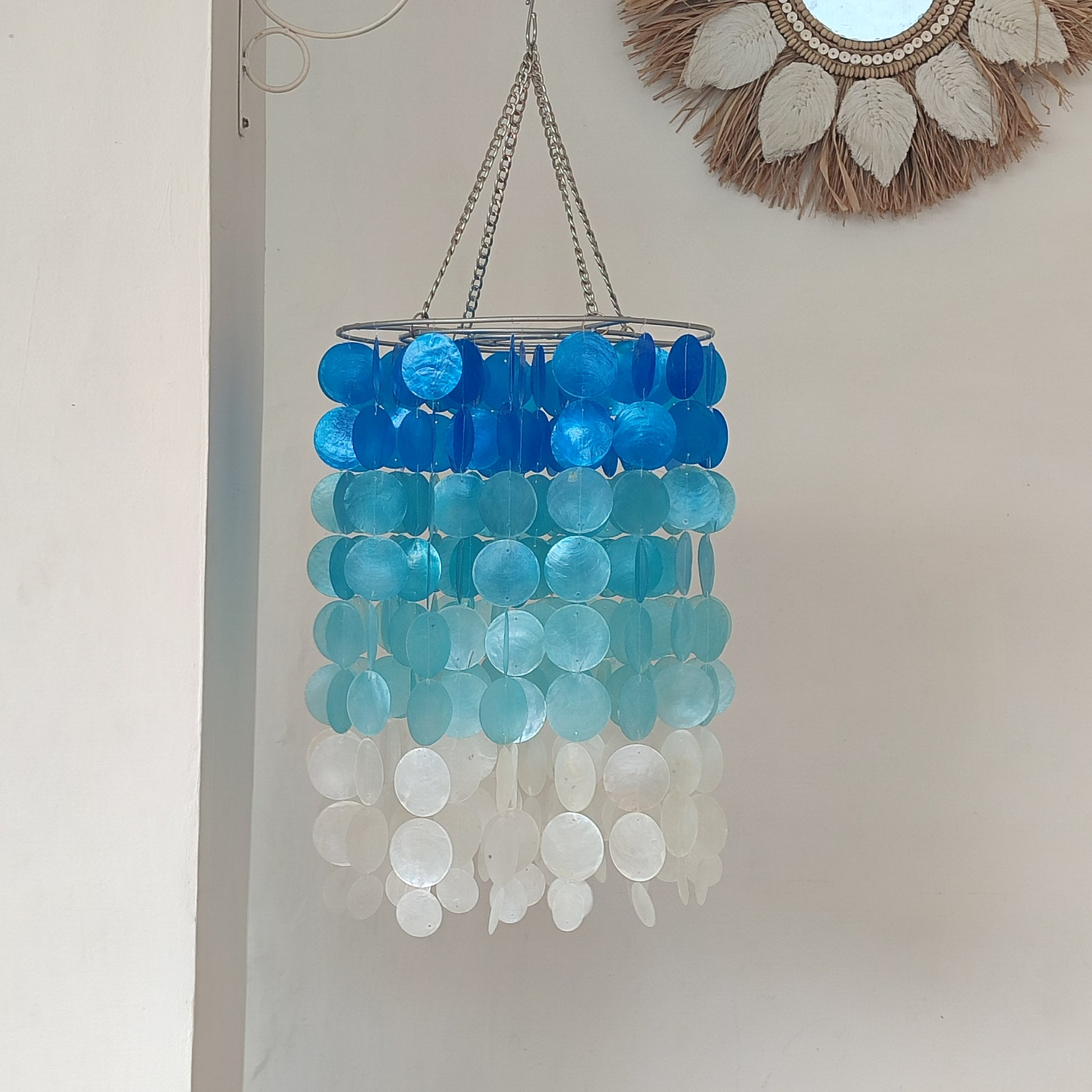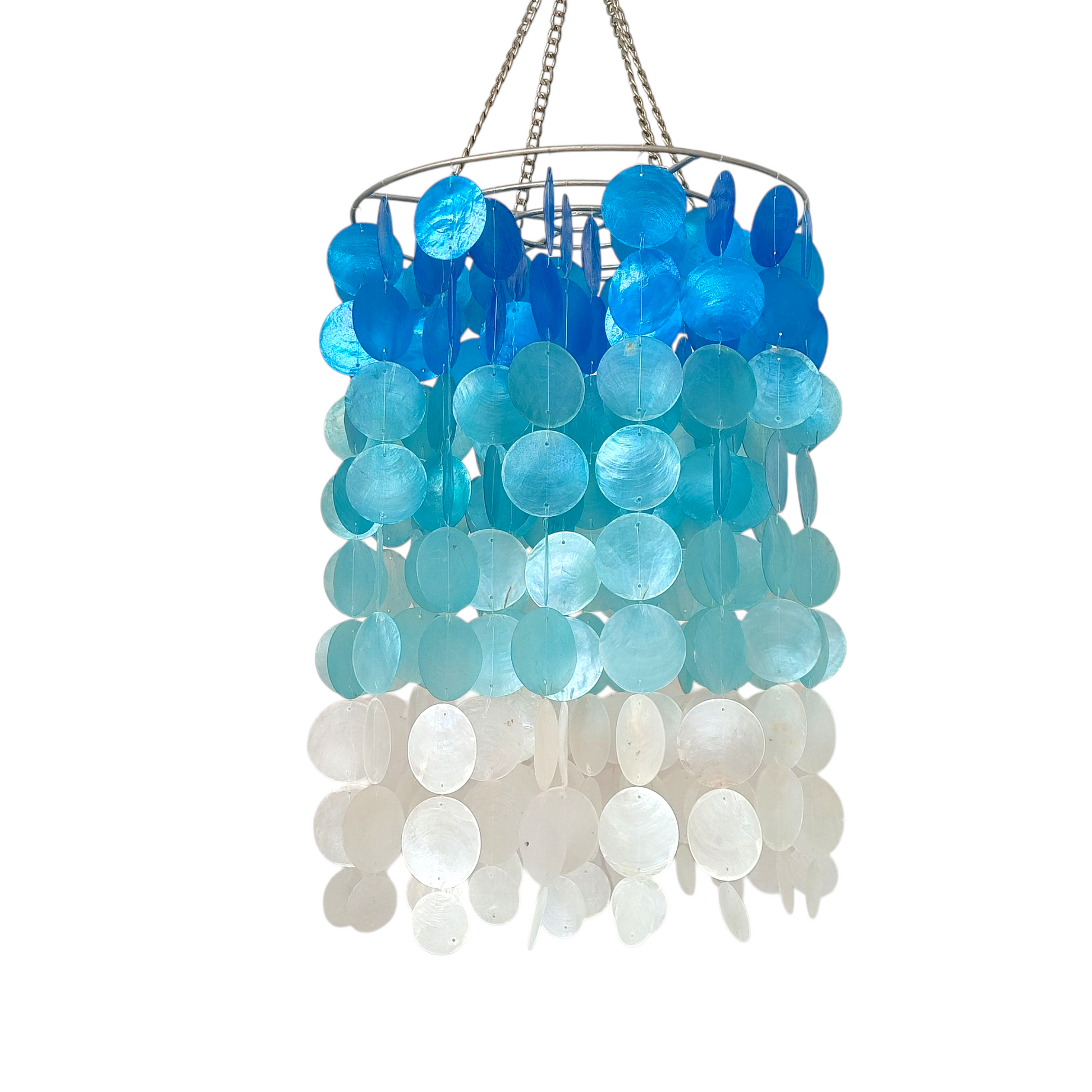 Delicate slices of capiz make for a gentle chime. Shells hang in a round in an ombre color variation from natural white to light blue to darker blue.