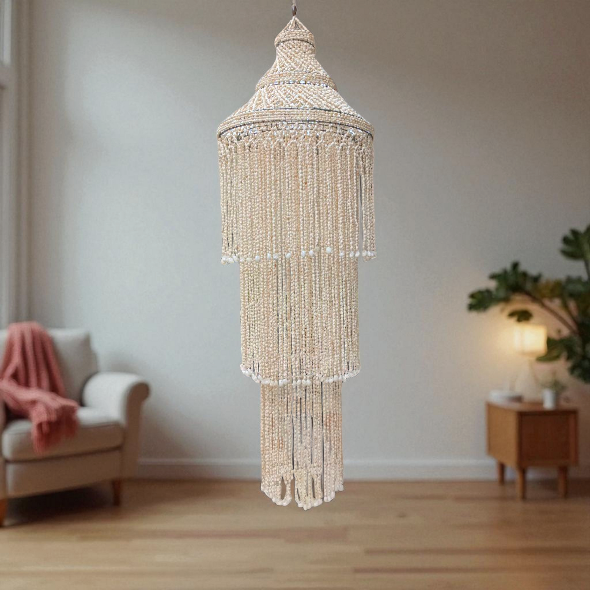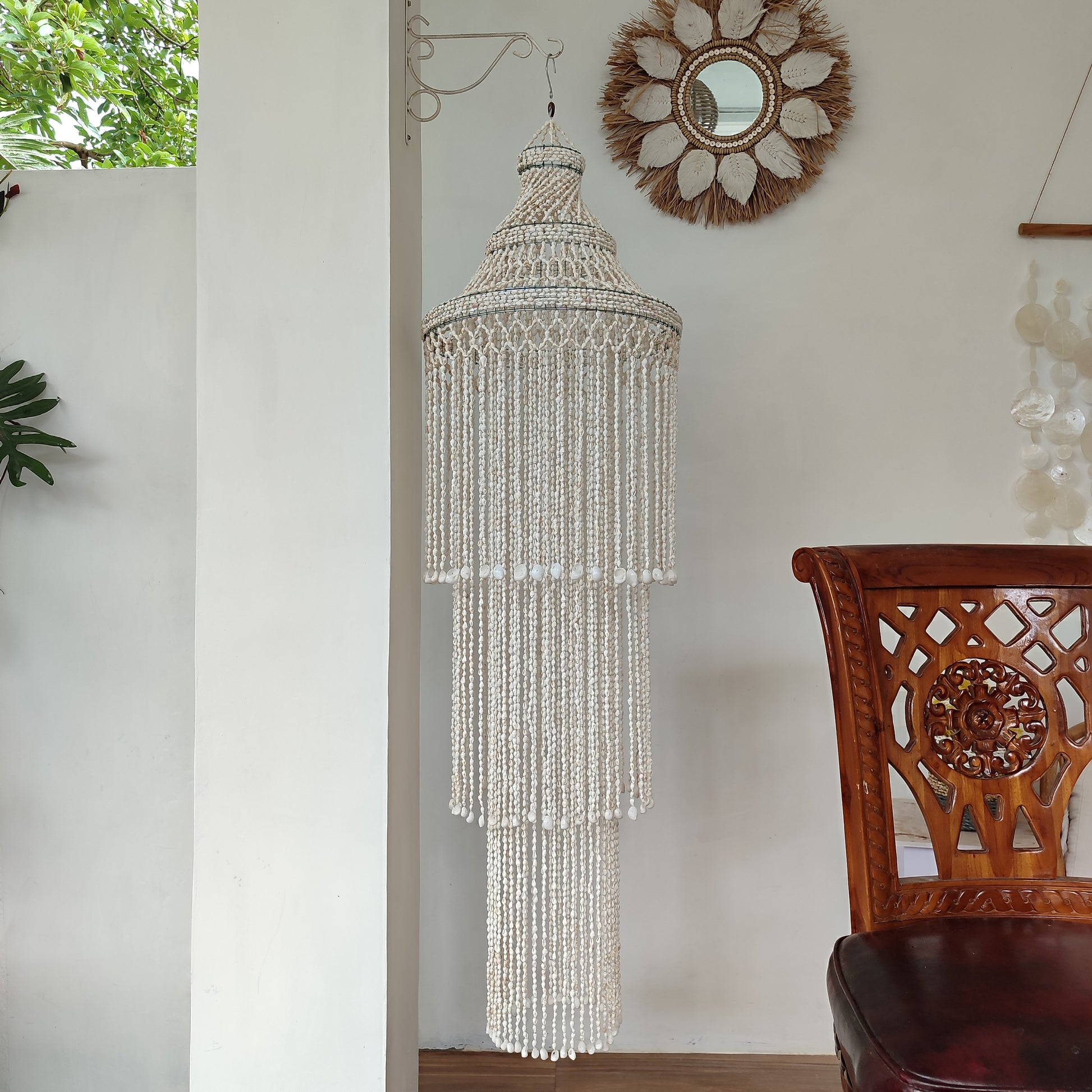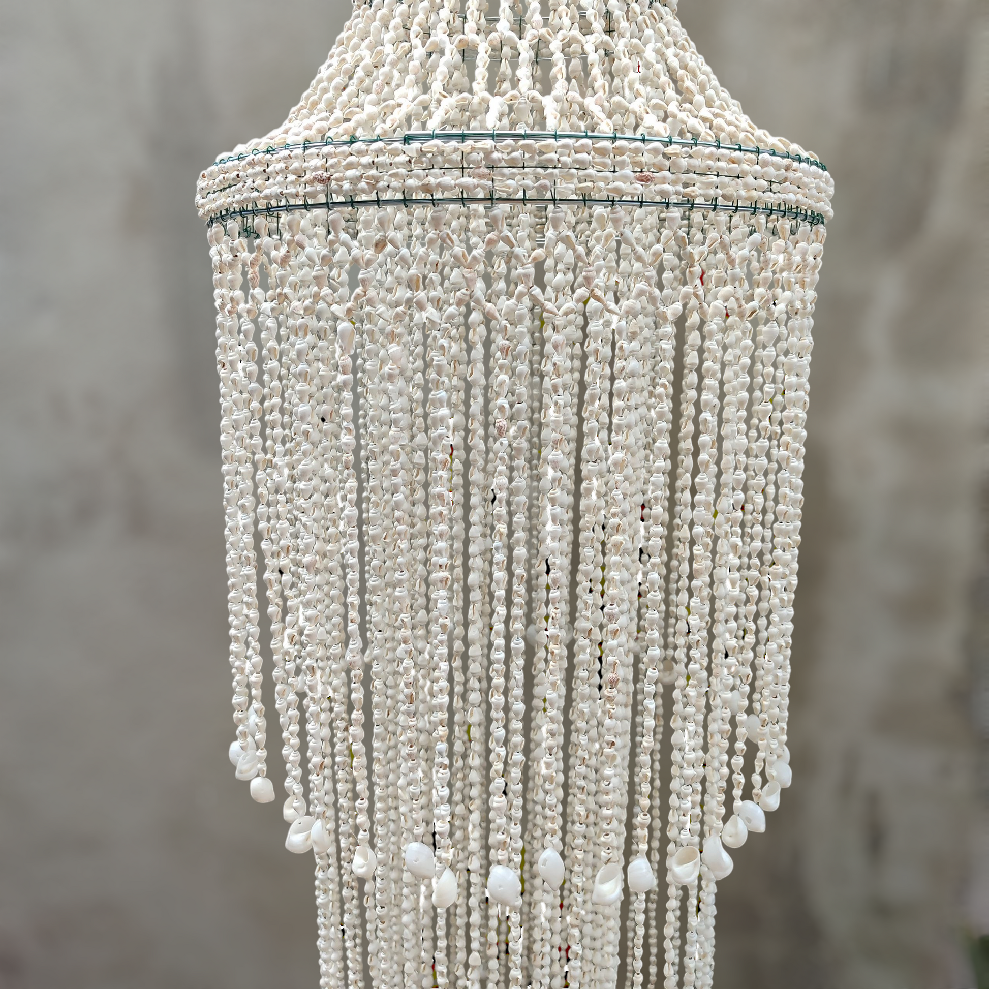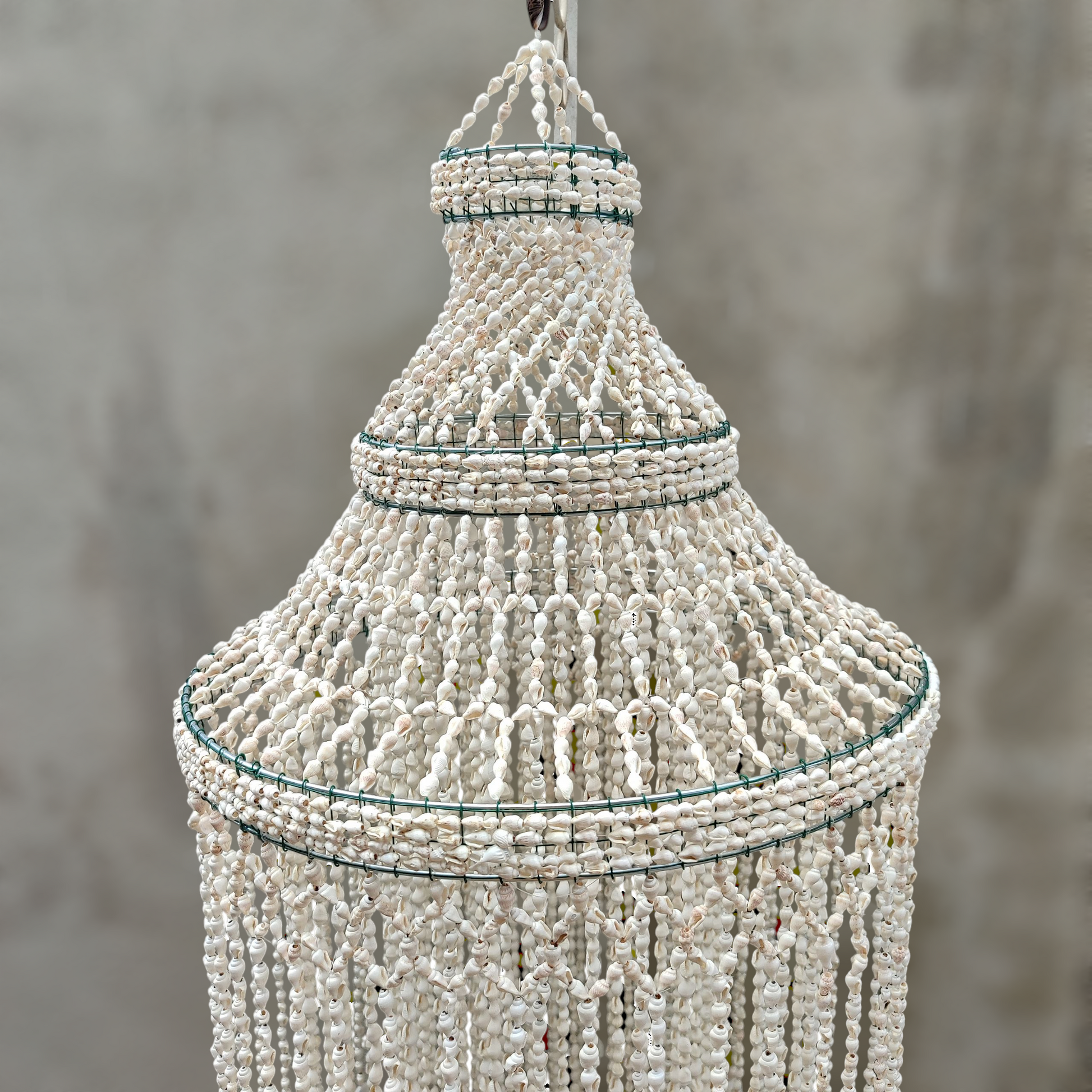The chandelier is hand-made by Indonesian craftsmen so sometimes comes with some imperfections like a partially twisted metal frame, irregularly hanging wires and imperfect sea shell.